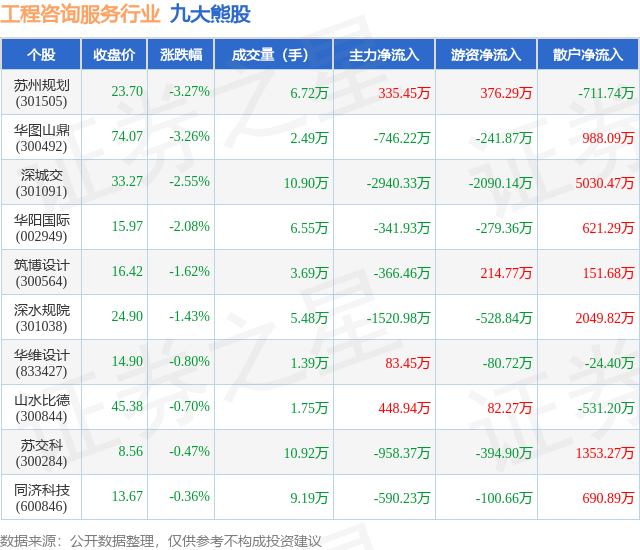 个股表现方面,工程咨询服务行业当日领跌股为苏州规划(301505),该股当日报收23.7,下跌3.27%,成交量6.72万,主力资金净流入335.45万元。华图山鼎(300492)以下跌3.26%紧随其后,该股当日成交量2.49万,主力资金净流出746.22万元。除此之外,深城交(301091)、华阳国际(002949)、筑博设计(300564)均进入当日熊股之列。具体个股列表见下表: