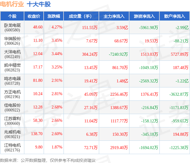 个股表现方面,电机行业当日领涨股为卧龙电驱(600580),该股当日报收48.6,上涨4.27%,成交量151.55万,主力资金净流入3.59亿元。华瑞股份(300626)以上涨3.45%紧随其后,该股当日成交量7.67万,主力资金净流入68.67万元。除此之外,大洋电机(002249)、凯中精密(002823)、鸣志电器(603728)均进入当日牛股之列。具体个股列表见下表: