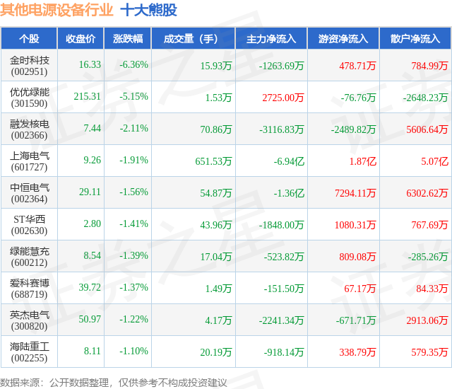 个股表现方面,其他电源设备行业当日领跌股为金时科技(002951),该股当日报收16.33,下跌6.36%,成交量15.93万,主力资金净流出1263.69万元。优优绿能(301590)以下跌5.15%紧随其后,该股当日成交量1.53万,主力资金净流入2725.0万元。除此之外,融发核电(002366)、上海电气(601727)、中恒电气(002364)均进入当日熊股之列。具体个股列表见下表: