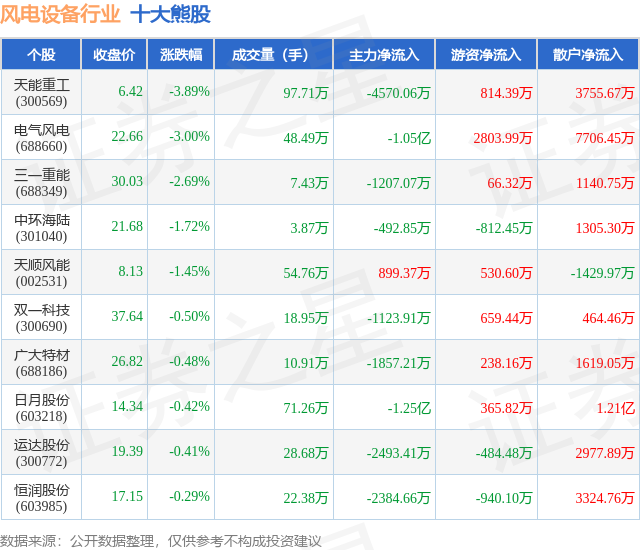个股表现方面,风电设备行业当日领跌股为天能重工(300569),该股当日报收6.42,下跌3.89%,成交量97.71万,主力资金净流出4570.06万元。电气风电(688660)以下跌3.0%紧随其后,该股当日成交量48.49万,主力资金净流出1.05亿元。除此之外,三一重能(688349)、中环海陆(301040)、天顺风能(002531)均进入当日熊股之列。具体个股列表见下表: