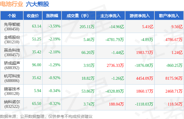 个股表现方面,电池行业当日领跌股为先导智能(300450),该股当日报收63.14,下跌3.59%,成交量205.11万,主力资金净流出14.96亿元。金杨股份(301210)以下跌2.19%紧随其后,该股当日成交量5.46万,主力资金净流出4781.79万元。除此之外,赢合科技(300457)、骄成超声(688392)、杭可科技(688006)均进入当日熊股之列。具体个股列表见下表: