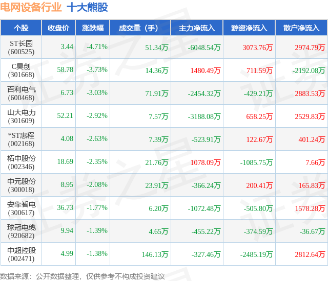 个股表现方面,电网设备行业当日领跌股为ST长园(600525),该股当日报收3.44,下跌4.71%,成交量51.34万,主力资金净流出6048.54万元。C昊创(301668)以下跌3.73%紧随其后,该股当日成交量14.36万,主力资金净流入1480.49万元。除此之外,百利电气(600468)、山大电力(301609)、*ST惠程(002168)均进入当日熊股之列。具体个股列表见下表:
