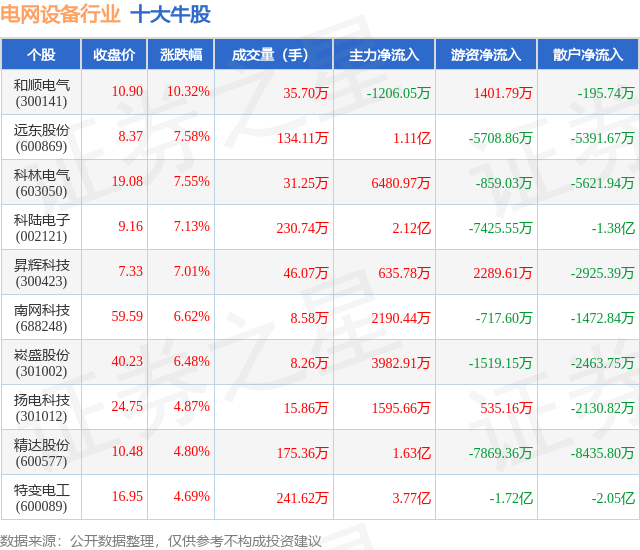 个股表现方面,电网设备行业当日领涨股为和顺电气(300141),该股当日报收10.9,上涨10.32%,成交量35.7万,主力资金净流出1206.05万元。远东股份(600869)以上涨7.58%紧随其后,该股当日成交量134.11万,主力资金净流入1.11亿元。除此之外,科林电气(603050)、科陆电子(002121)、昇辉科技(300423)均进入当日牛股之列。具体个股列表见下表: