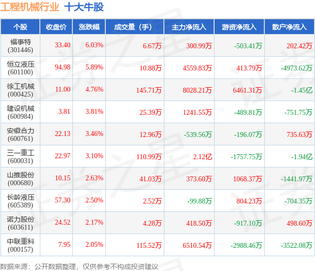 个股表现方面,工程机械行业当日领涨股为福事特(301446),该股当日报收33.4,上涨6.03%,成交量6.67万,主力资金净流入300.99万元。恒立液压(601100)以上涨5.89%紧随其后,该股当日成交量10.88万,主力资金净流入4559.83万元。除此之外,徐工机械(000425)、建设机械(600984)、安徽合力(600761)均进入当日牛股之列。具体个股列表见下表:
