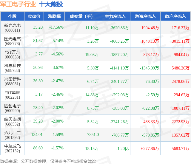 个股表现方面,军工电子行业当日领跌股为新光光电(688011),该股当日报收35.2,下跌17.56%,成交量11.1万,主力资金净流出3620.86万元。国光电气(688776)以下跌5.14%紧随其后,该股当日成交量3.26万,主力资金净流出4663.25万元。除此之外,*ST万方(000638)、科思科技(688788)、兴图新科(688081)均进入当日熊股之列。具体个股列表见下表: