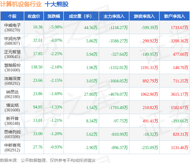 个股表现方面,计算机设备行业当日领跌股为中威电子(300270),该股当日报收10.38,下跌5.98%,成交量44.56万,主力资金净流出1134.27万元。中润光学(688307)以下跌4.07%紧随其后,该股当日成交量5.86万,主力资金净流出3588.27万元。除此之外,正元智慧(300645)、慧翰股份(301600)、浩瀚深度(688292)均进入当日熊股之列。具体个股列表见下表: