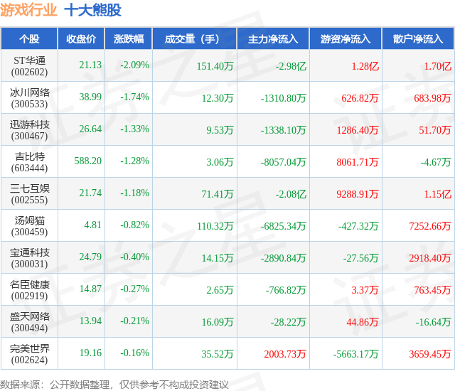 个股表现方面,游戏行业当日领跌股为ST华通(002602),该股当日报收21.13,下跌2.09%,成交量151.4万,主力资金净流出2.98亿元。冰川网络(300533)以下跌1.74%紧随其后,该股当日成交量12.3万,主力资金净流出1310.8万元。除此之外,迅游科技(300467)、吉比特(603444)、三七互娱(002555)均进入当日熊股之列。具体个股列表见下表: