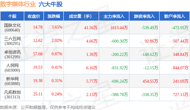 个股表现方面,数字媒体行业当日领涨股为国脉文化(600640),该股当日报收14.78,上涨3.65%,成交量41.56万,主力资金净流入1013.44万元。三六五网(300295)以上涨2.02%紧随其后,该股当日成交量4.66万,主力资金净流出600.3万元。除此之外,卓创资讯(301299)、人民网(603000)、新华网(603888)均进入当日牛股之列。具体个股列表见下表:
