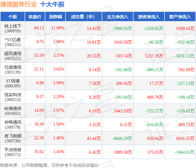 个股表现方面,通信服务行业当日领涨股为线上线下(300959),该股当日报收84.13,上涨11.9%,成交量14.43万,主力资金净流出7960.56万元。*ST亿通(300211)以上涨5.86%紧随其后,该股当日成交量10.81万,主力资金净流入1018.58万元。除此之外,超讯通信(603322)、元道通信(301139)、ST信通(600289)均进入当日牛股之列。具体个股列表见下表:
