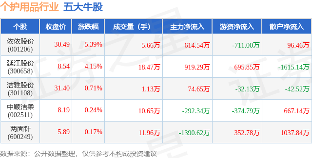 个股表现方面,个护用品行业当日领涨股为依依股份(001206),该股当日报收30.49,上涨5.39%,成交量5.66万,主力资金净流入614.54万元。延江股份(300658)以上涨4.15%紧随其后,该股当日成交量18.47万,主力资金净流入919.29万元。除此之外,洁雅股份(301108)、中顺洁柔(002511)、两面针(600249)均进入当日牛股之列。具体个股列表见下表: