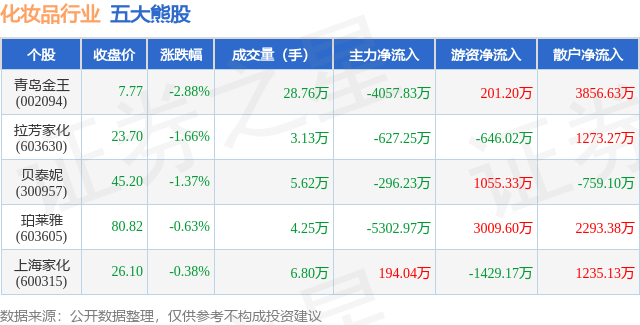 个股表现方面,化妆品行业当日领跌股为青岛金王(002094),该股当日报收7.77,下跌2.88%,成交量28.76万,主力资金净流出4057.83万元。拉芳家化(603630)以下跌1.66%紧随其后,该股当日成交量3.13万,主力资金净流出627.25万元。除此之外,贝泰妮(300957)、珀莱雅(603605)、上海家化(600315)均进入当日熊股之列。具体个股列表见下表: