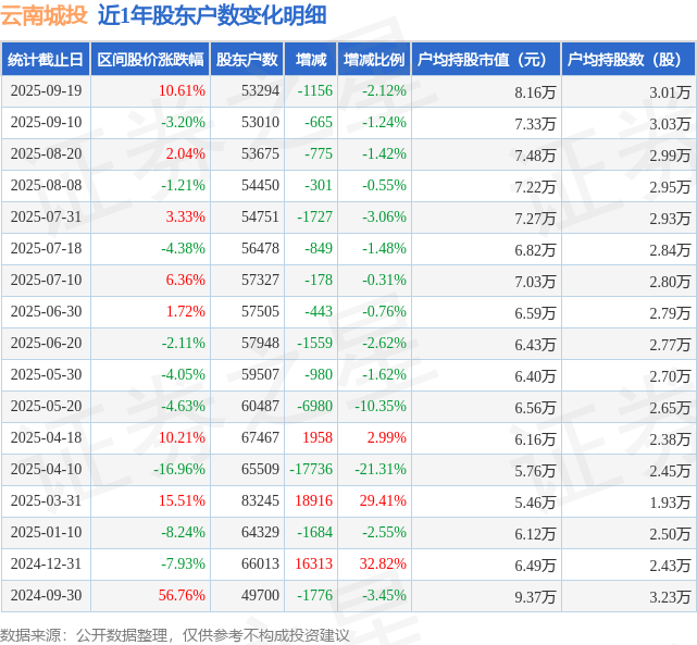 从股价来看,2025年8月8日至2025年9月19日,云南城投区间涨幅为10.61%,在此期间股东户数减少1156.0户,减幅为2.12%。