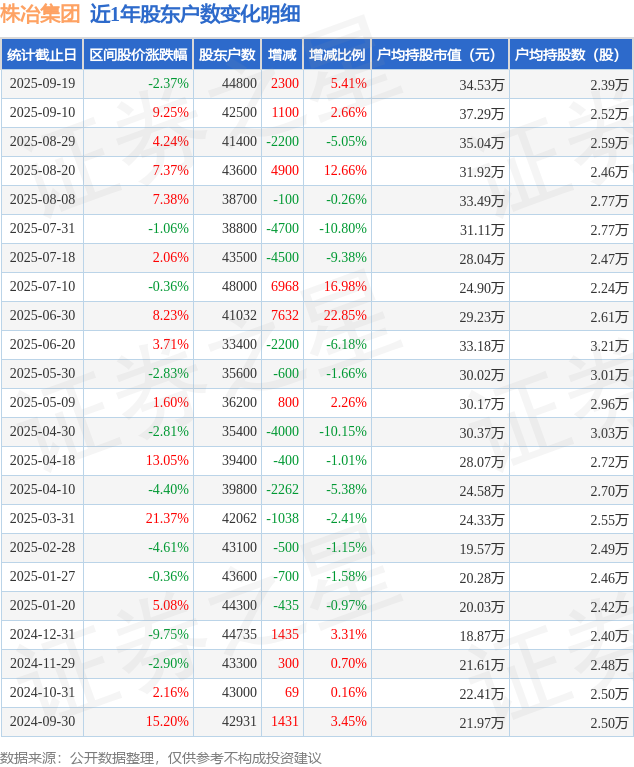 从股价来看,2025年9月10日至2025年9月19日,株冶集团区间跌幅为2.37%,在此期间股东户数增加2300.0户,增幅为5.41%。