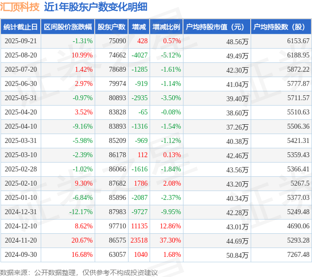 从股价来看,2025年8月20日至2025年9月21日,汇顶科技区间跌幅为1.31%,在此期间股东户数增加428.0户,增幅为0.57%。