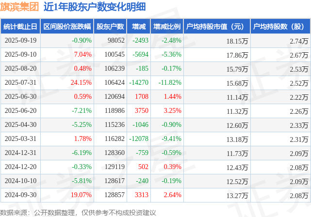 证券之星消息,近日旗滨集团披露,截至2025年9月19日公司股东户数为9.81万户,较9月10日减少2493.0户,减幅为2.48%。户均持股数量由上期的2.67万股增加至2.74万股,户均持股市值为18.15万元。
