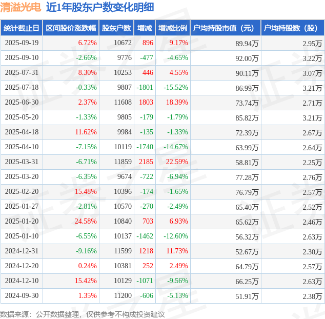 从股价来看,2025年9月10日至2025年9月19日,清溢光电区间涨幅为6.72%,在此期间股东户数增加896.0户,增幅为9.17%。