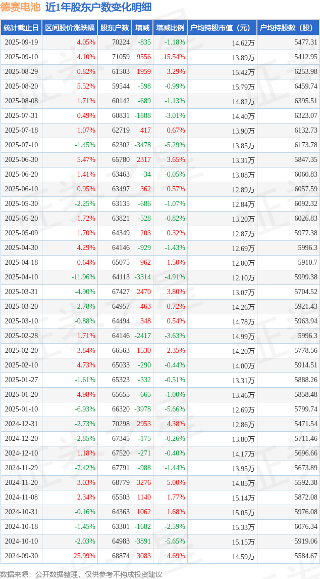 从股价来看,2025年9月10日至2025年9月19日,德赛电池区间涨幅为4.05%,在此期间股东户数减少835.0户,减幅为1.18%。