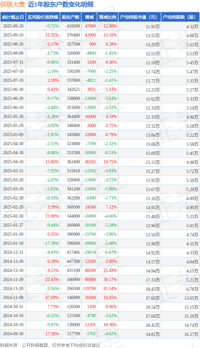 从股价来看,2025年9月10日至2025年9月20日,供销大集区间跌幅为0.72%,在此期间股东户数增加4.78万户,增幅为12.9%。