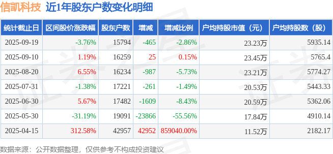 从股价来看,2025年9月10日至2025年9月19日,信凯科技区间跌幅为3.76%,在此期间股东户数减少465.0户,减幅为2.86%。