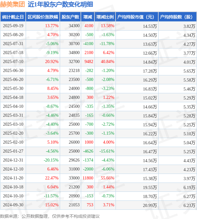 从股价来看,2025年8月20日至2025年9月19日,赫美集团区间涨幅为13.77%,在此期间股东户数增加4100.0户,增幅为13.58%。