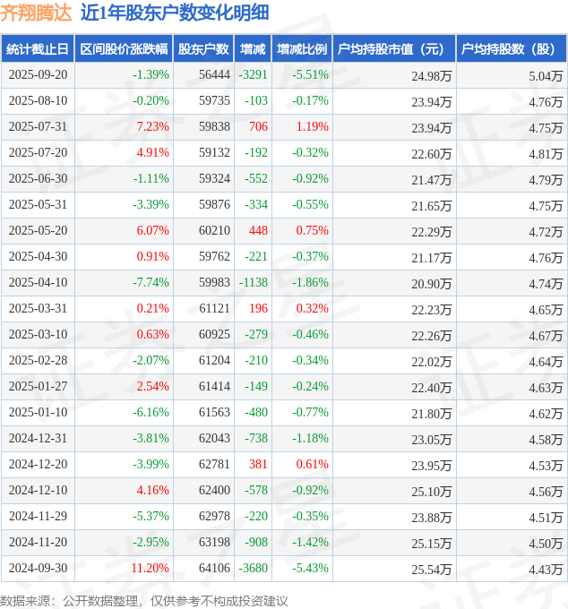 从股价来看,2025年8月10日至2025年9月20日,齐翔腾达区间跌幅为1.39%,在此期间股东户数减少3291.0户,减幅为5.51%。