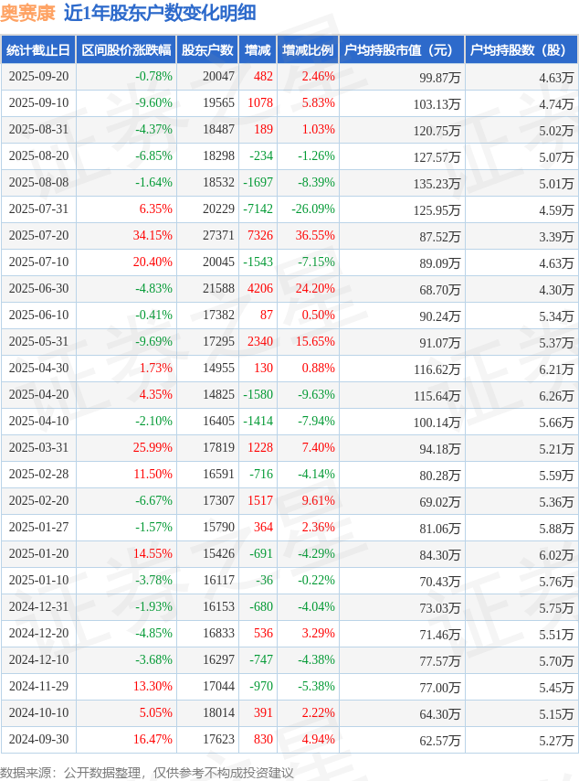 从股价来看,2025年9月10日至2025年9月20日,奥赛康区间跌幅为0.78%,在此期间股东户数增加482.0户,增幅为2.46%。