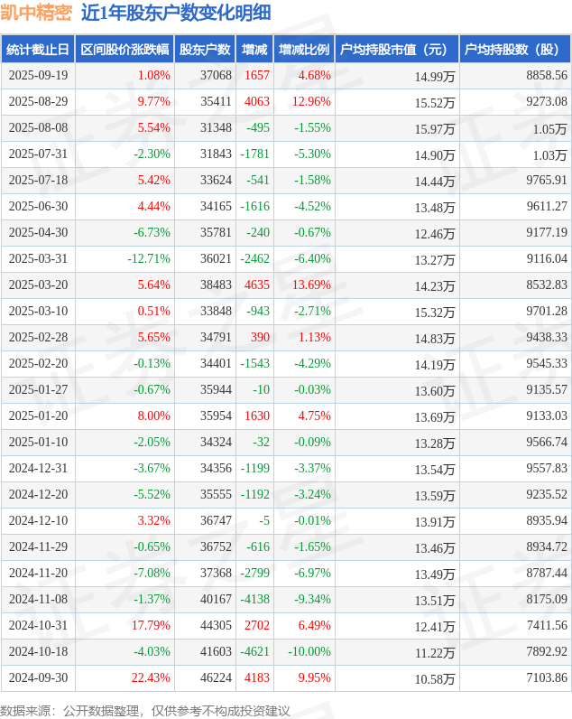 从股价来看,2025年8月29日至2025年9月19日,凯中精密区间涨幅为1.08%,在此期间股东户数增加1657.0户,增幅为4.68%。