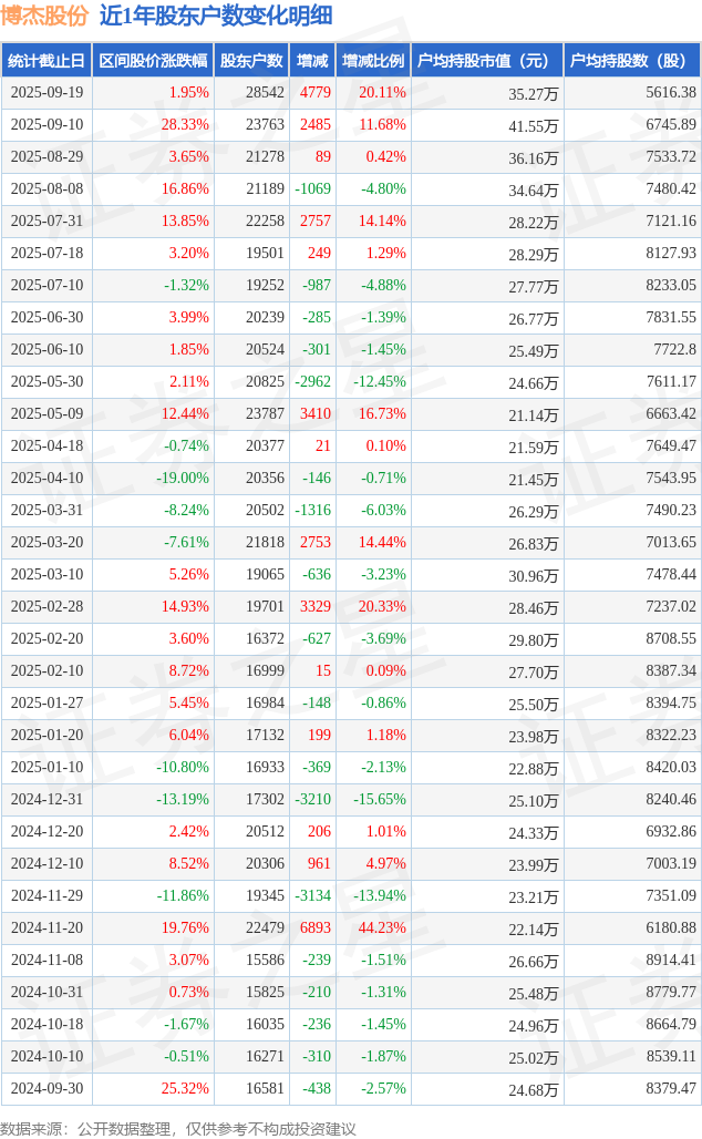 从股价来看,2025年9月10日至2025年9月19日,博杰股份区间涨幅为1.95%,在此期间股东户数增加4779.0户,增幅为20.11%。
