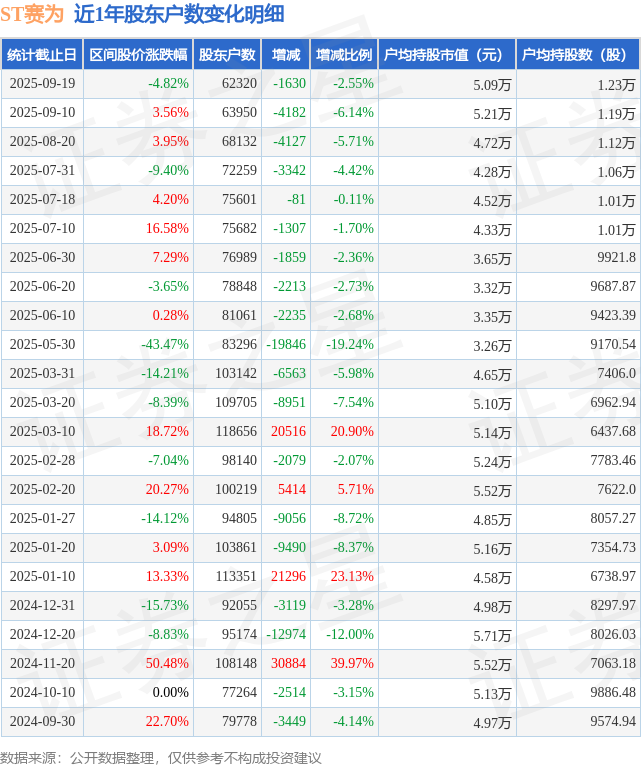 从股价来看,2025年9月10日至2025年9月19日,ST赛为区间跌幅为4.82%,在此期间股东户数减少1630.0户,减幅为2.55%。