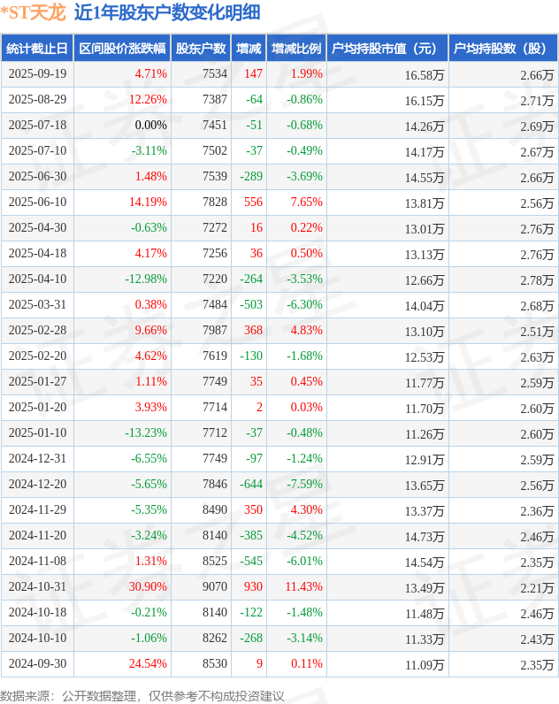 从股价来看,2025年8月29日至2025年9月19日,*ST天龙区间涨幅为4.71%,在此期间股东户数增加147.0户,增幅为1.99%。