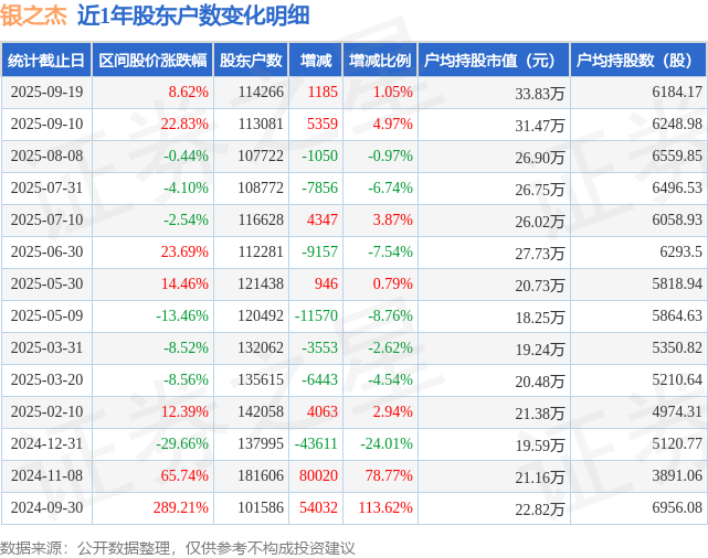 从股价来看,2025年9月10日至2025年9月19日,银之杰区间涨幅为8.62%,在此期间股东户数增加1185.0户,增幅为1.05%。
