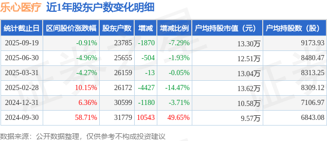 从股价来看,2025年6月30日至2025年9月19日,乐心医疗区间跌幅为0.91%,在此期间股东户数减少1870.0户,减幅为7.29%。
