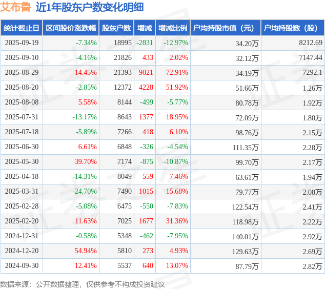 从股价来看,2025年9月10日至2025年9月19日,艾布鲁区间跌幅为7.34%,在此期间股东户数减少2831.0户,减幅为12.97%。
