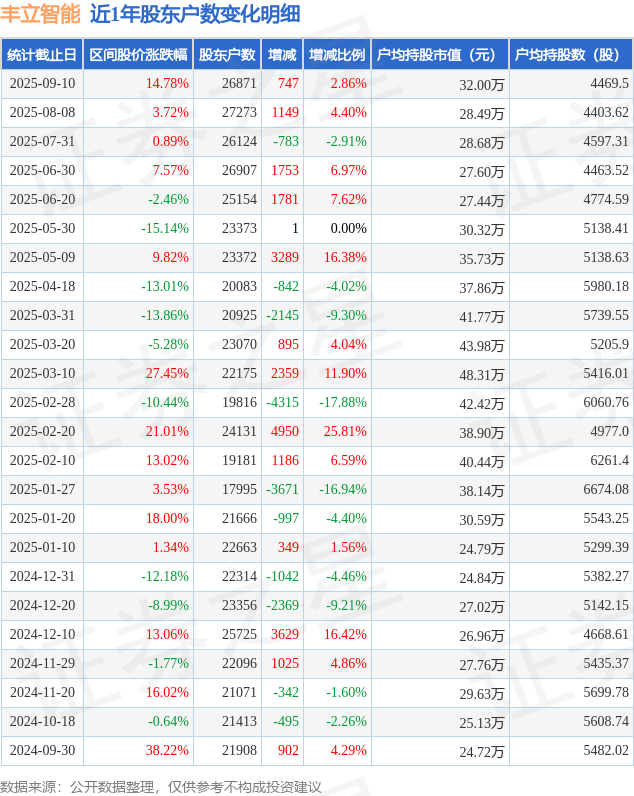 从股价来看,2025年7月31日至2025年9月10日,丰立智能区间涨幅为14.78%,在此期间股东户数增加747.0户,增幅为2.86%。