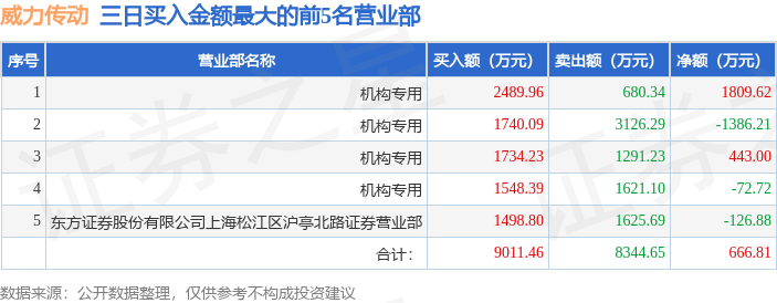 证券之星消息,沪深交易所2025年9月29日公布的交易公开信息显示,威力传动(300904)因日换手率达到30%的前5只证券,连续三个交易日内,涨幅偏离值累计达到30%的证券登上龙虎榜。此次是近5个交易日内第2次上榜。