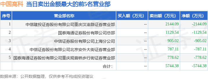 证券之星消息,沪深交易所2025年9月29日公布的交易公开信息显示,中国高科(600730)因有价格涨跌幅限制的日收盘价格跌幅偏离值达到7%的前五只证券登上龙虎榜。此次是近5个交易日内第1次上榜。