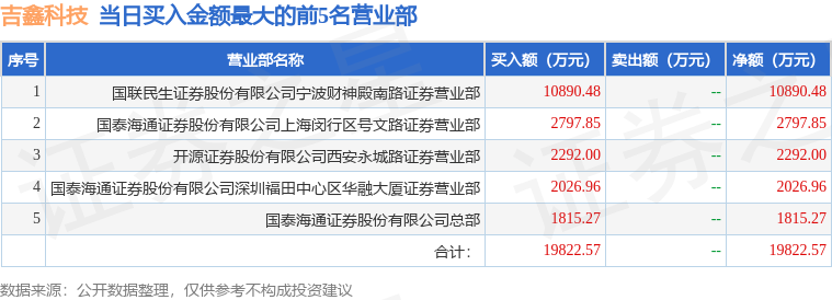 证券之星消息,沪深交易所2025年9月29日公布的交易公开信息显示,吉鑫科技(601218)因有价格涨跌幅限制的日收盘价格涨幅偏离值达到7%的前五只证券登上龙虎榜。此次是近5个交易日内第3次上榜。