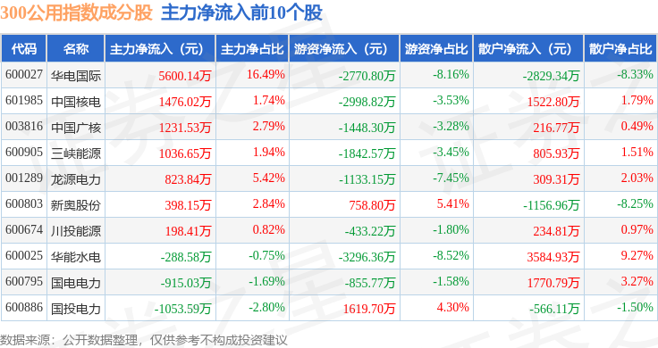 资金流向方面,300公用(000917)指数成份股当日主力资金净流入合计109.55万元,游资资金净流出合计1.31亿元,散户资金净流入合计1.3亿元。成份股资金流向详情见下表:
