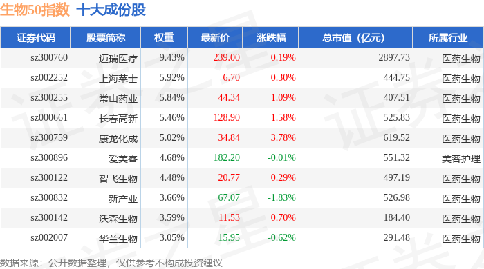 证券之星消息,9月29日,生物50(399280)指数报收于2218.94点,涨0.38%,成交130.33亿元,换手率1.35%。当日该指数成份股中,上涨的有29家,康龙化成以3.78%的涨幅领涨,下跌的有18家,康华生物以2.34%的跌幅领跌。