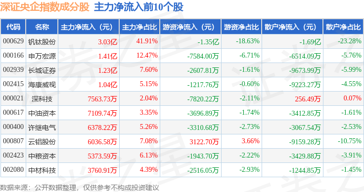 资金流向方面,深证央企(399335)指数成份股当日主力资金净流出合计2.23亿元,游资资金净流出合计2.7亿元,散户资金净流入合计4.93亿元。成份股资金流向详情见下表: