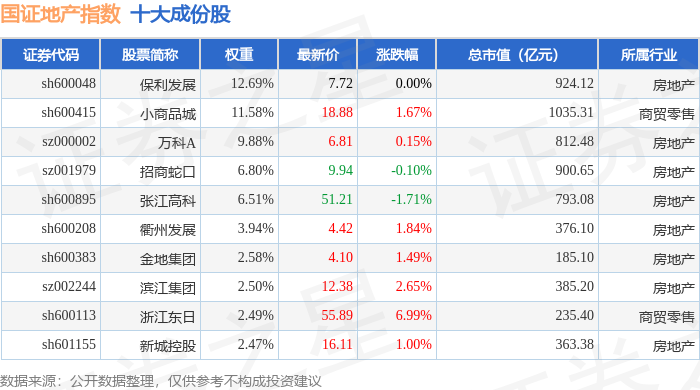 证券之星消息,9月29日,国证地产(399393)指数报收于3522.48点,涨0.95%,成交229.38亿元,换手率1.84%。当日该指数成份股中,上涨的有37家,万业企业以8.99%的涨幅领涨,下跌的有9家,市北高新以3.27%的跌幅领跌。