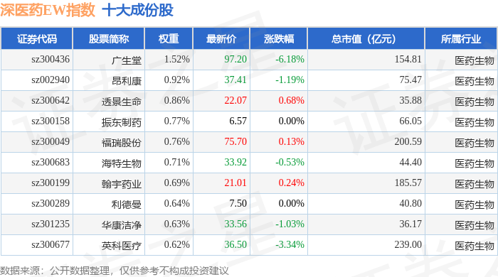 证券之星消息,9月29日,深医药EW(399676)指数报收于3768.43点,跌0.01%,成交423.64亿元,换手率1.82%。当日该指数成份股中,上涨的有127家,吉林敖东以6.69%的涨幅领涨,下跌的有80家,广生堂以6.18%的跌幅领跌。