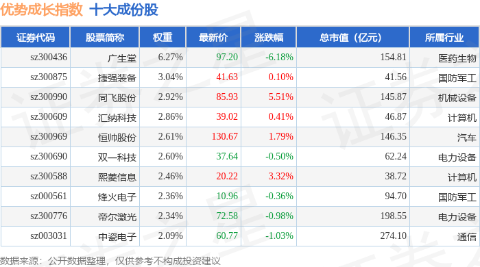 优势成长(399698)指数十大成份股详情如下:
