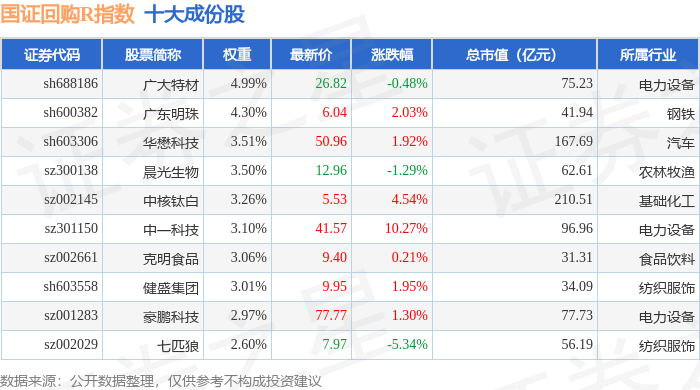 证券之星消息,9月29日,国证回购R(480063)指数报收于3858.97点,涨0.33%,成交150.26亿元,换手率1.63%。当日该指数成份股中,上涨的有27家,中一科技以10.27%的涨幅领涨,下跌的有20家,七匹狼以5.34%的跌幅领跌。