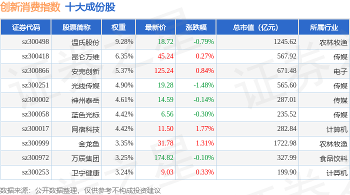 证券之星消息,9月29日,创新消费(970041)指数报收于2579.0点,跌0.09%,成交221.77亿元,换手率2.85%。当日该指数成份股中,上涨的有23家,捷成股份以4.16%的涨幅领涨,下跌的有27家,无线传媒以7.6%的跌幅领跌。