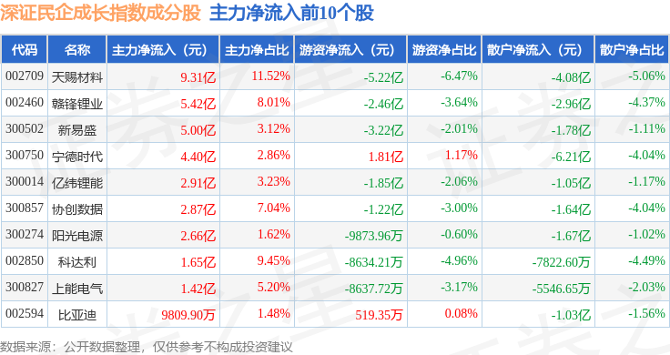 资金流向方面,深证民企成长(970071)指数成份股当日主力资金净流入合计20.55亿元,游资资金净流出合计7.86亿元,散户资金净流出合计12.69亿元。成份股资金流向详情见下表: