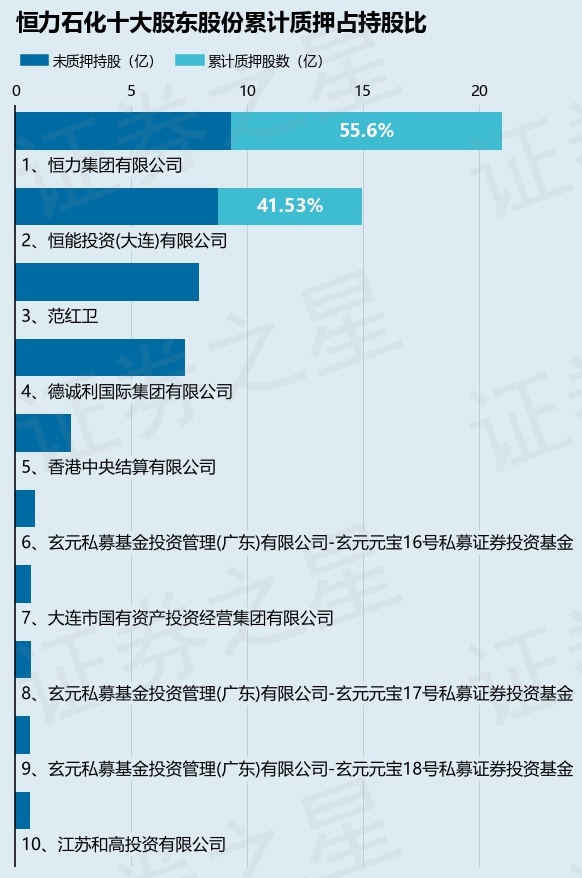 截止本公告日,股东恒力集团有限公司已累计质押股份11.68亿股,占其持股总数的55.6%,股东恒能投资(大连)有限公司已累计质押股份6.22亿股,占其持股总数的41.53%。本次质押后恒力石化十大股东的累计质押股份占持股比例(占持股比例的计算以公司最新一期财务报表公布的十大股东的持股总数为基准)见下图: