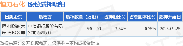证券之星消息,恒力石化(600346)9月29日公开信息显示,股东恒能投资(大连)有限公司向中信银行股份有限公司苏州分行合计质押5300.0万股,占总股本0.75%。质押详情见下表: