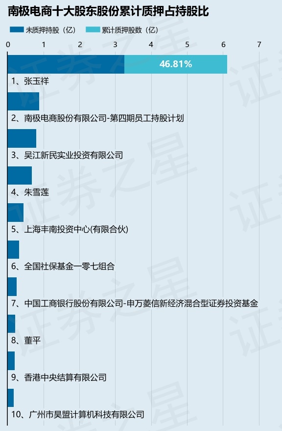 截止本公告日,股东张玉祥已累计质押股份2.87亿股,占其持股总数的46.81%。本次质押后南极电商十大股东的累计质押股份占持股比例(占持股比例的计算以公司最新一期财务报表公布的十大股东的持股总数为基准)见下图: