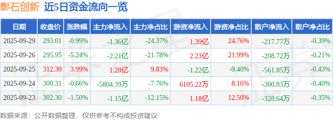 证券之星消息,截至2025年9月29日收盘,影石创新(688775)报收于293.01元,下跌0.99%,换手率6.24%,成交量1.9万手,成交额5.6亿元。